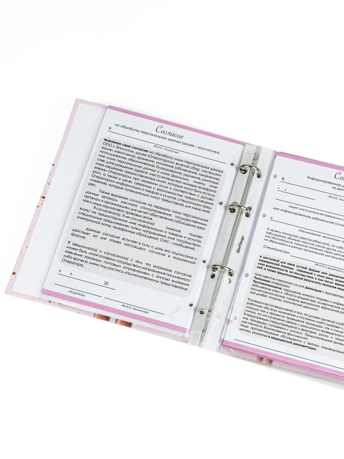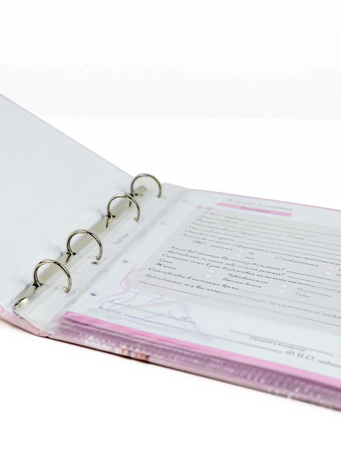 Удобная стильная папка на кольцах позволяет хранить необходимую информацию о клиенте на листах приятного розового цвета. В книгу добавлены яркие разделители, что позволяет быстро находить нужный бланк. Все листы имеют перфорацию, таким образом комплекты бланков можно хранить как в файлах, так непосредственно помещая на кольца папки. Книгу удобно брать с собой, она размера А5 и с легкостью помещается в сумку или рюкзак.